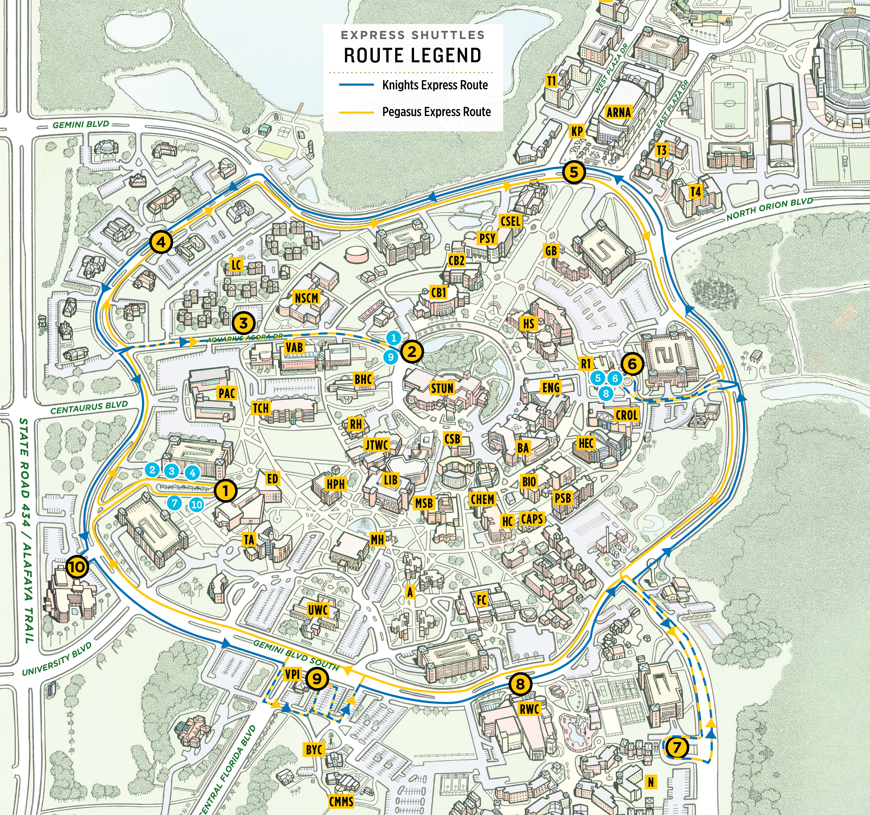 The Pegasus Express and Knights Express are the on-campus shuttles available to take students, employees and guests around campus. The Pegasus Express runs clock-wise on the Gemini loop and the Knights Express runs counter-clockwise on the same loop. There are ten designated stops that are in proximity to most academic buildings and popular locations on campus. In addition to students and employees, guests visiting the university may also utilize this complimentary bus service. All shuttles are ADA accessible and operate when classes are in session Monday – Friday.